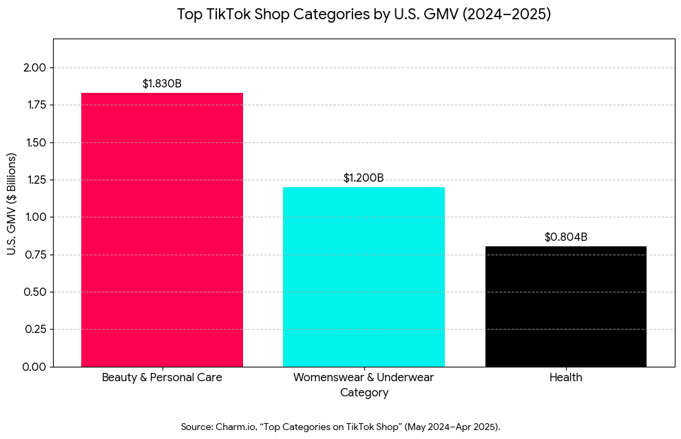 • Beauty, womenswear, and health lead TikTok Shop GMV, but the same “scroll to purchase” behavior appears across many product types.