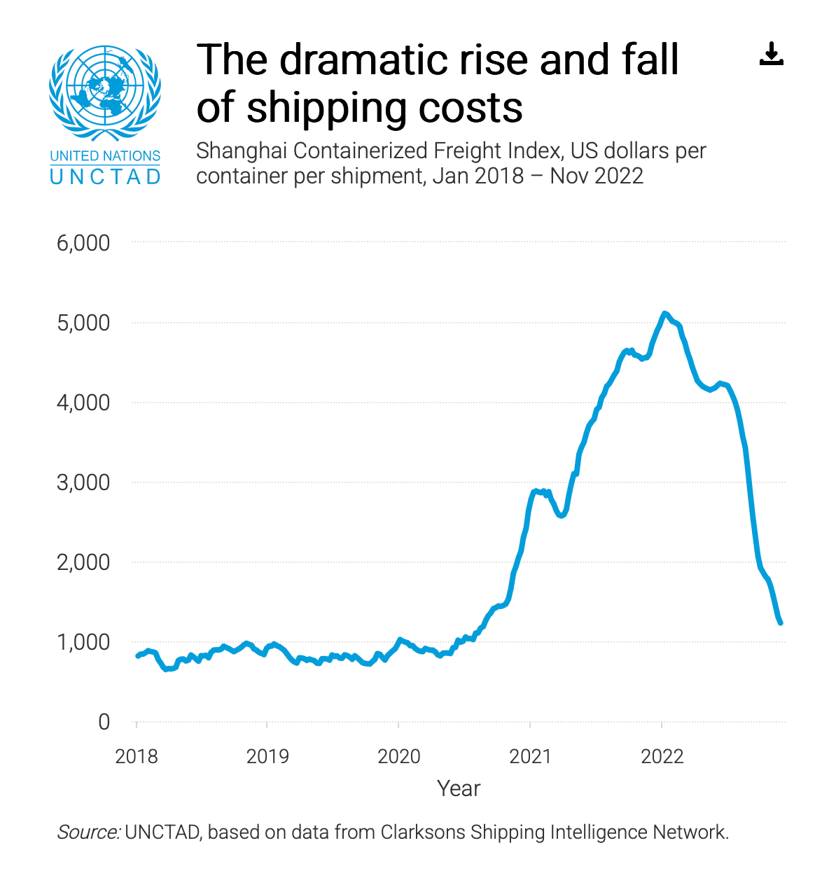 - 2020–2022 pandemic era: Global port congestion and equipment imbalances pushed container rates to record highs. Drewry’s World Container Index shows spot rates on major routes climbing to more than $10,000 per FEU at the peak, many times higher than pre-pandemic norms.