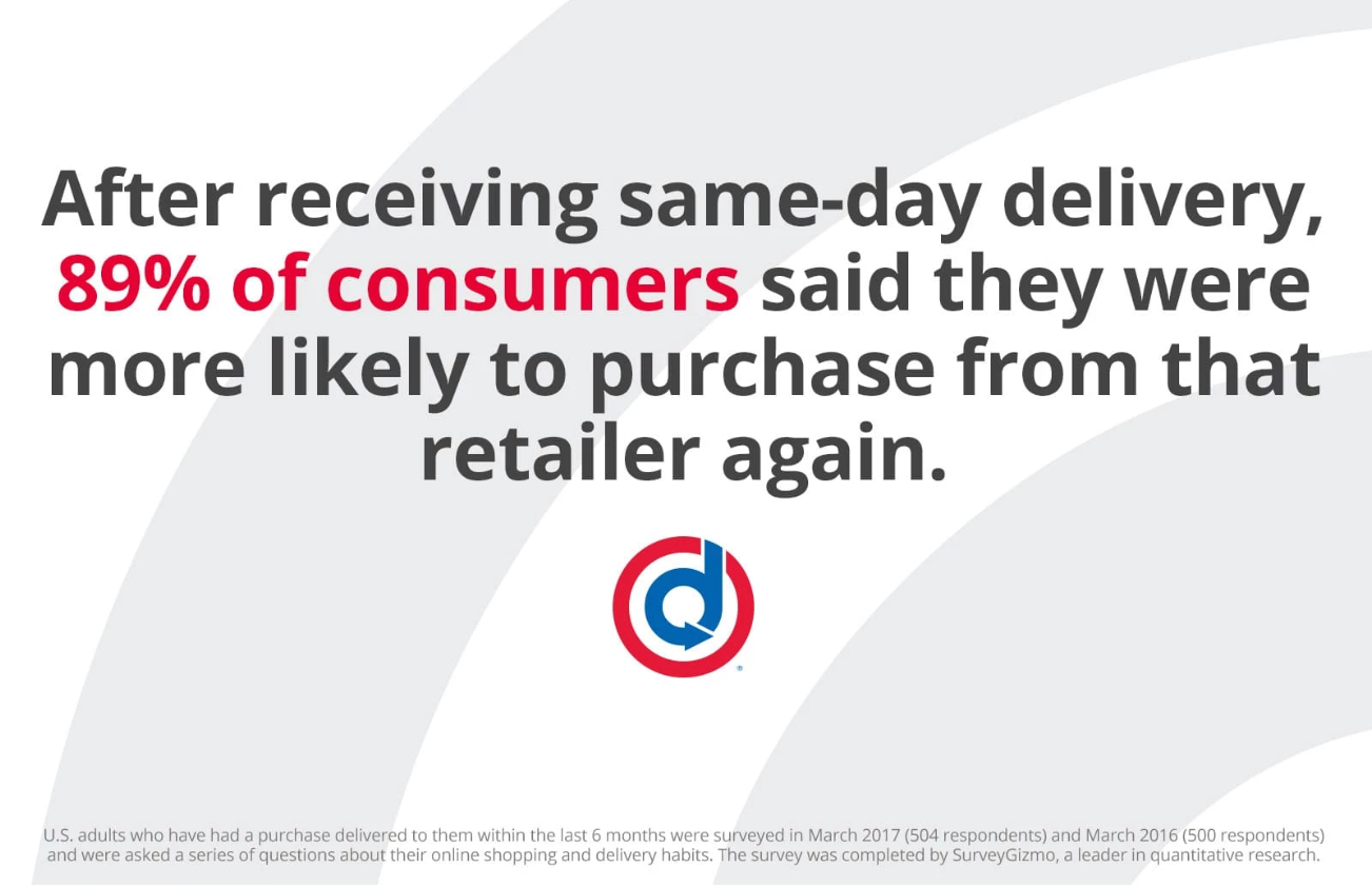Consumer surveys show that same-day expectations are rising, especially among younger shoppers accustomed to instant everything. In fact, nearly 90% of customers are more likely to buy from the same retailer after receiving same-day delivery.